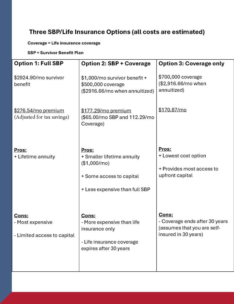 While we can’t give recommendations in this article, with our clients we find those that would pick options 1, 3 and 6 often decide that full SBP is their best bet, those that would pick options 2, 4 and 5 may want to forgo SBP and instead opt for a term life insurance policy and those that pick some other combination may be most comfortable with a combination of term life insurance and SBP.  The best path to deciding is a team approach with the help of a fee-only financial advisor